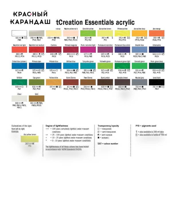 Акрил ART CREATION («Арт Криэйшен») производится в городе Апелдорн голландской компанией «ROYAL TALENS». Основал её Мартин Таленс (Marten Talens) в 1899 году. Титул «Royal» (Ройал, королевский) компания получила в 1949 году от королевской четы за высокое качество продукции и следование традициям. «ROYAL TALENS» производит все виды художественных красок и является одним из ведущих производителей в своей отрасли. Акрил ART CREATION – современная и уникальная краска, произведенная на основе 100% акриловой смолы. Краску можно использовать для работы на различных поверхностях - бумага, холст, дерево, камень. Акрил ART CREATION имеет густую пастообразную структуру, при необходимости разводится водой. Быстро сохнет. После высыхания краска становится водонепроницаемой. Акрил ART CREATION представлен богатой палитрой и выпускается поштучно в тубах по 75 миллилитров и в наборах различной комплектации.
