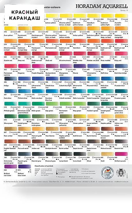 О серии: профессиональные акварельные краски «Horadam» известны миру благодаря своему качеству. Полная палитра серии включает в себя 110 цветовых оттенков. Акварель серии «Horadam» выпускается в маленьких кюветах и тубах объёмом 5 миллилитров. Все цвета представлены поштучно и в наборах различной комплектации. Характеристика: для производства акварели «Horadam» используются пигменты, прошедшие тщательный контроль качества. Для изготовления связующего для акварели этой серии используется гуммиарабик, который закупают в южном регионе Сахары. Краски характеризуются яркими и насыщенными цветами с высочайшим уровнем светостойкости (почти у всех цветов уровень светостойкости 5 из 5). Применение: для профессионального использования. Подходят для выполнения работ во всех техниках акварельной живописи. Особенности производства: кюветы акварели «Horadam» наполняются краской по уникальной технологии. Акварель заливается в кюветы в жидком виде за 4 раза. Это означает, что после вливания небольшого количества краски ей дают высохнуть в течении нескольких недель в сушильной камере при специальных условиях. Второй, третий и четвёртый шаг заполнения кюветы проходит также. Такая технология позволяет акварели сохранить равномерную концентрацию пигментов. Срок изготовления краски с такой технологией может достигать 3-5 месяцев. Производство: изготавливаются компанией Schmincke, которая была основана в 1881 в Германии. Уже четыре поколения компания производит лучшие товары для художников по всей Европе и за ее пределами. Два химика Josef Horadam и Hermann Schmincke экспериментировали с пигментами и маслом и получили уникальный рецепт, который до сих пор жив и используется при изготовлении масляных красок этого производителя. Девиз компании, который запечатлен на гербе «Meliora COGITO» («Я стремлюсь к совершенству!») подтвержден веками и порождает лучшие товары для профессиональных художников.