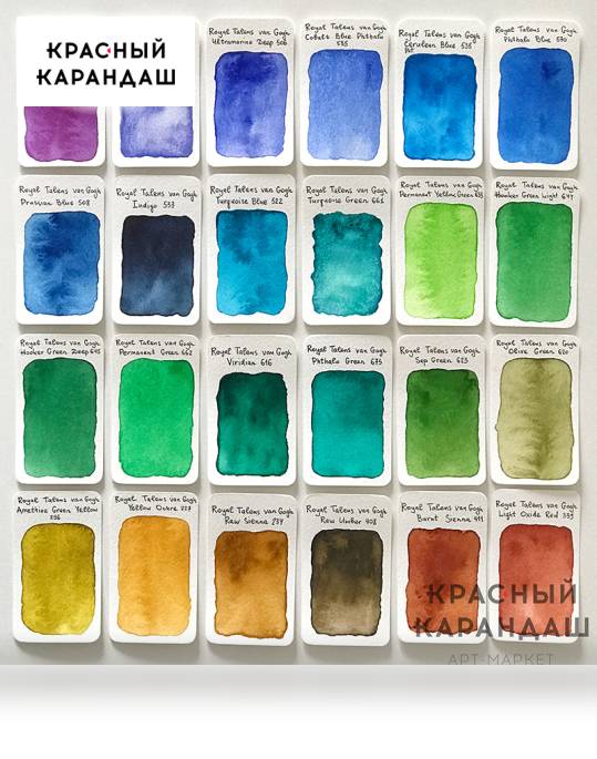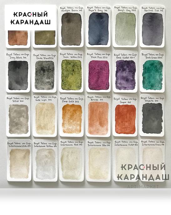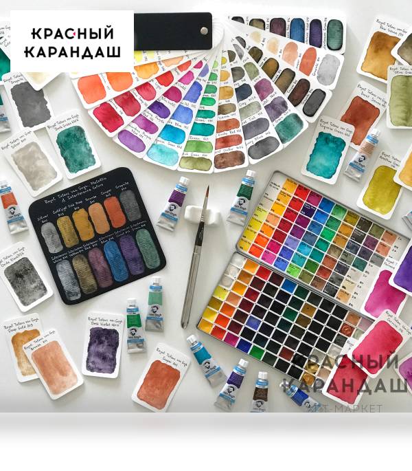 Акция: Создайте свой акварельный набор! При покупке от 12 кювет акварели вы получаете скидку 15% на все цвета и пластиковый пенал на 12 цветов с кистью в подарок. Акварель Talens "Van Gogh" – прекрасный выбор, как для профессиональных художников, так и для любителей. В состав краски входят пигменты высокой степени очистки и чистый гуммиарабик. Акварель Talens "Van Gogh" — это прозрачная краска с насыщенными и яркими цветами. Легко наносится на поверхность. Все цвета смешиваются между собой, образуя новые оттенки. Краска, даже сильно разведенная водой, обладает высокой светостойкостью. Палитра акварели Talens "Van Gogh" пополнилась 32 новыми цветами (ищите цвета с пометкой NEW), среди новинок представлены: интерферентные цвета, цвета с металлическим эффектом, цвета с эффектом грануляции, а так же новые оттенки с различными характеристиками укрывистости (подробнее читайте в обзоре). Полная палитра насчитывает 72 цвета. Краски выпускаются поштучно в кюветах по 1.3 миллилитра. Обратите внимание, что интерферентные цвета, цвета с металлическим эффектом, переливающиеся и цвета хамелеоны предназначены для использования на черной акварельной бумаге, так они наилучшим образом проявляют свои свойства. Акварель Talens "Van Gogh" производится в городе Апелдорн голландской компанией «ROYAL TALENS». Основал её Мартин Таленс (Marten Talens) в 1899 году. Титул «Royal» (Ройал, королевский) компания получила в 1949 году от королевской четы за высокое качество продукции и следование традициям. «ROYAL TALENS» производит все виды художественных красок и является одним из ведущих производителей в своей отрасли.