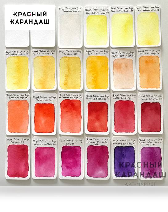 Акция: Создайте свой акварельный набор! При покупке от 12 кювет акварели вы получаете скидку 15% на все цвета и пластиковый пенал на 12 цветов с кистью в подарок. Акварель Talens "Van Gogh" – прекрасный выбор, как для профессиональных художников, так и для любителей. В состав краски входят пигменты высокой степени очистки и чистый гуммиарабик. Акварель Talens "Van Gogh" — это прозрачная краска с насыщенными и яркими цветами. Легко наносится на поверхность. Все цвета смешиваются между собой, образуя новые оттенки. Краска, даже сильно разведенная водой, обладает высокой светостойкостью. Палитра акварели Talens "Van Gogh" пополнилась 32 новыми цветами (ищите цвета с пометкой NEW), среди новинок представлены: интерферентные цвета, цвета с металлическим эффектом, цвета с эффектом грануляции, а так же новые оттенки с различными характеристиками укрывистости (подробнее читайте в обзоре). Полная палитра насчитывает 72 цвета. Краски выпускаются поштучно в кюветах по 1.3 миллилитра. Обратите внимание, что интерферентные цвета, цвета с металлическим эффектом, переливающиеся и цвета хамелеоны предназначены для использования на черной акварельной бумаге, так они наилучшим образом проявляют свои свойства. Акварель Talens "Van Gogh" производится в городе Апелдорн голландской компанией «ROYAL TALENS». Основал её Мартин Таленс (Marten Talens) в 1899 году. Титул «Royal» (Ройал, королевский) компания получила в 1949 году от королевской четы за высокое качество продукции и следование традициям. «ROYAL TALENS» производит все виды художественных красок и является одним из ведущих производителей в своей отрасли.