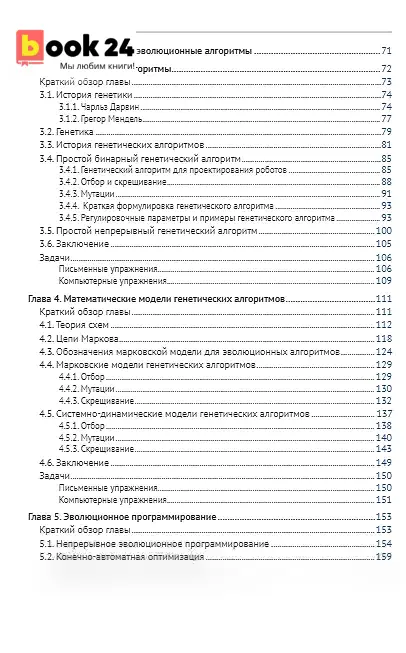 Эволюционные алгоритмы обусловлены процессами оптимизации, которые мы наблюдаем в природе, такими как естественный отбор, миграция видов, стаи птиц, человеческая культура и муравьиные семьи. .В данной книге рассматриваются история, теоретические основы, математический аппарат и программирование алгоритмов эволюционной оптимизации. Рассмотренные алгоритмы включают в себя генетические алгоритмы, генетическое программирование, оптимизацию на основе муравьиной кучи, оптимизацию на основе роя частиц, дифференциальную эволюцию, биогеографическую оптимизацию и многие другие. .