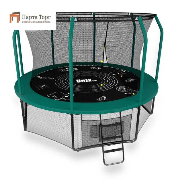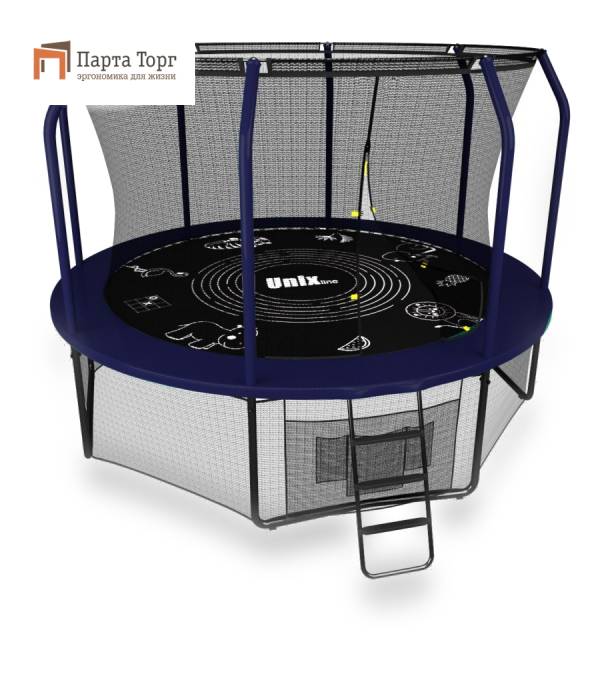 Прыжковое полотно со специальной пропиткой, позволяющей на нем рисовать; Мелки для рисования в комплекте; Для ежедневного использования детьми и взрослыми Устойчив к неблагоприятным погодным условиям Металлический каркас из особо прочной гальванизированной стали Система креплений деталей рамы батута «X-Conneсtor» Гарантия на раму 2 года Прыжковое полотно повышенной износостойкости Защитный мат для пружин состоит из четырех слоев Все батуты модельного ряда UNIX line оборудованы нижней защитной сеткой Кол-во ног (опор) 3 W-ноги