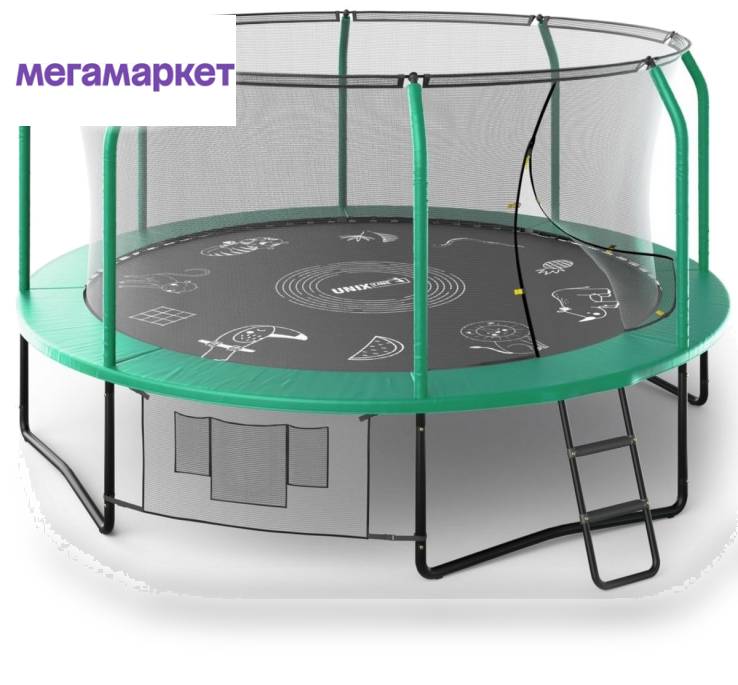 Основные игры на батутах UNIX line SUPREME GAME (4 in 1): 1. «Лабиринт». Данная игра лучше всего подходит для двоих, когда один игрок перекрывает проходы создавая лабиринт, а другой игрок пытается его пройти. Второй вариант игры – найти путь от одного животного к другому. 2. «Крестики-нолики». Всем известная игра, давно полюбившаяся детям и взрослым 3. «Раскрась животное». Все изображения на прыжковом полотне разработаны таким образом, чтобы их могли разукрасить даже самые юные художники, но стоит включить воображение, например добавить тени и изобразить детали, как животные буквально «оживают», поэтому данное занятие придется по вкусу и более опытным любителям живописи. 4. «Нарисуй сам». Для реализации самых интересных идей дизайнеры батутов UNIX line SUPREME GAME (4 in 1) специально оставили пустые места на прыжковом полотне. Полная свобода творчества, ограничивающаяся лишь фантазией художника. (!) для рисования на прыжковом полотне, необходимо использовать только мелки для асфальта (!) ручки, карандаши, маркеры, фломастеры и иные пишущие средства запрещены для использования на прыжковом полотне_______________________________________ Батуты UNIX line премиальной серии SUPREME разработаны для ежедневного использования детьми и взрослыми, устойчивы к неблагоприятным погодным условиям и соответствуют международным стандартам качества ISO 9001. Металлический каркас батутов выполнен из особо прочной гальванизированной стали толщиной до 2 мм с использованием новейшей системы креплений деталей рамы батута «X-Conneсtor» (толщина стали 2.4 мм), что обеспечивает высокую надежность рамы и уровень безопасности пользователя, максимально допустимый вес которого, в зависимости от модели (размера), может достигать 180 кг. Гарантия на раму 2 года!!! Прыжковое полотно премиальных батутов UNIX line SUPREME обладает повышенной износостойкостью благодаря высокой плотности волокон полипропилена (перматрон), из которых состоит само полотно. Защитный мат для пружин, расположенный по периметру батута, состоит из четырех слоев, обшитых ПВХ материалом, плотностью 150 г/см3 и надежно закрывает пружины.