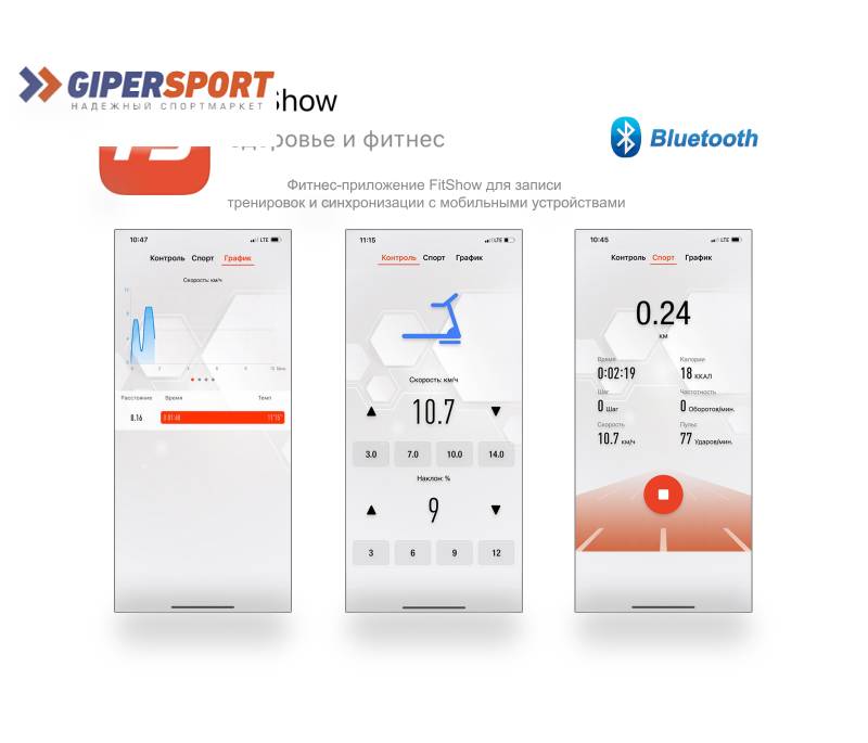 профиль, время, скорость, дистанция, калории, пульс, угол наклона, шаги