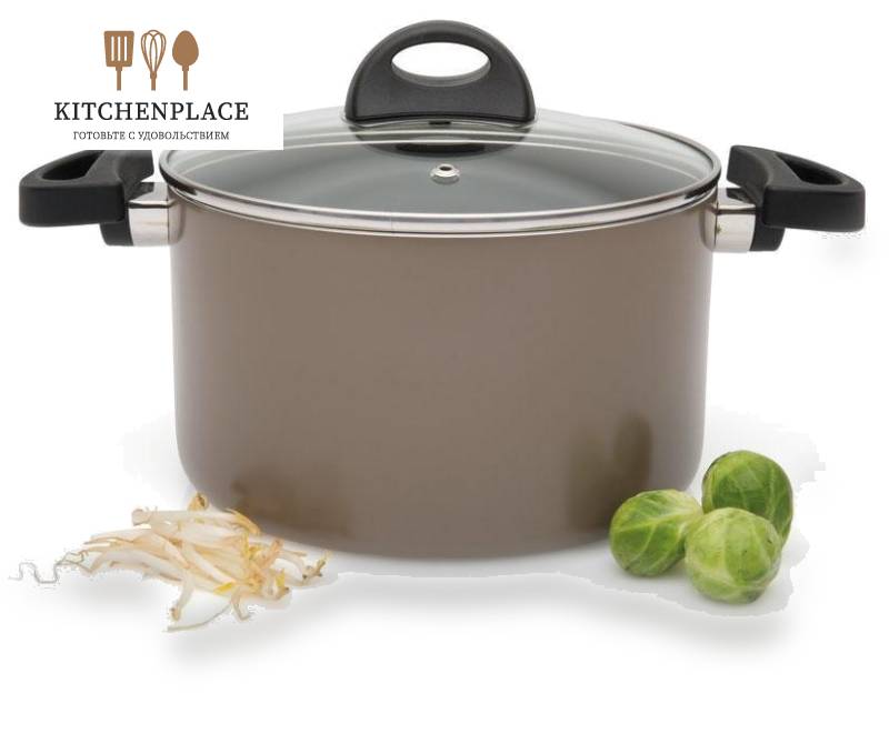 Кастрюля подходит для всех типов плит, кроме индукционных. Ручки изделия выполнены из алюминия, что обеспечивает удобство и безопасность в использовании.
