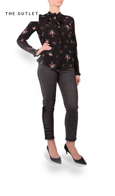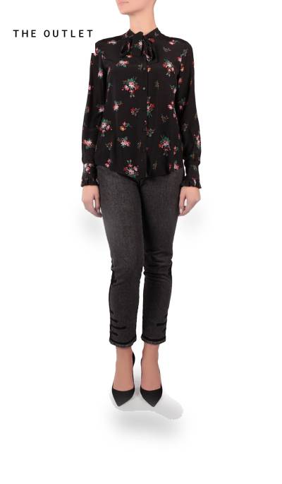 Черная блуза с цветочным принтом дополнена завязками на шее.