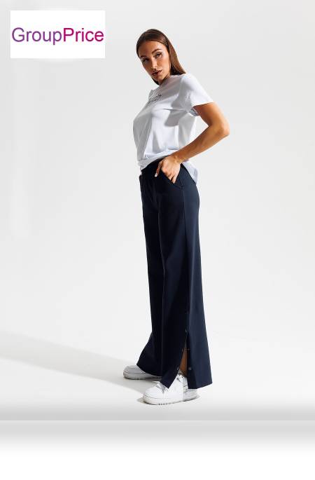 Брюки женские длинные, широкие по всей длине. Внутренние боковые карманы с наклонным входом. Пояс отрезной с резинкой и декоративными строчками. По бокам брюк высокие шлицы с функциональными кнопками.