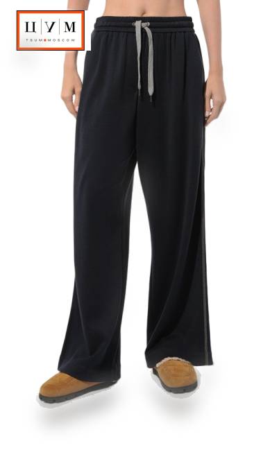 Темно-синие брюки с широким поясом-кулиской и врезными карманами украшены узкими лампасами из тонких переливающихся цепочек мониль, знаковых для марки. Мастера бренда, основанного Брунелло Кучинелли, сшили свободную модель из гладкого хлопкового трикотажа с добавлением прочных шелковых волокон.