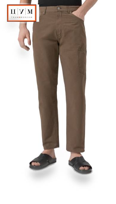 Брюки Paco с пятью карманами и еще одним слева выполнили из хлопкового поплина с добавлением шелка. Окрашенную в готовом виде модель украсили фирменной металлической деталью и имитацией жакрона сзади.