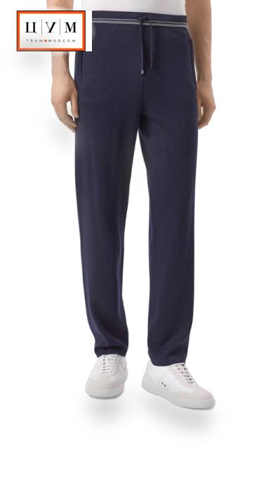 Прямые брюки с боковыми карманами на молниях выполнили из шерстяного трикотажа, в состав которого добавили шелк. Широкий пояс-кулиску подчеркнули контрастными полосами.