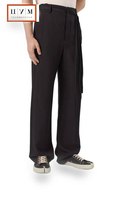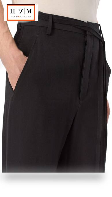 Широкие брюки Leon из вискозного габардина с добавлением шерсти дополнили боковыми карманами и прорезными задними, на одном из которых есть клапан с пуговицей. В шлевки на поясе продели узкую репсовую ленту со свободно ниспадающими концами.