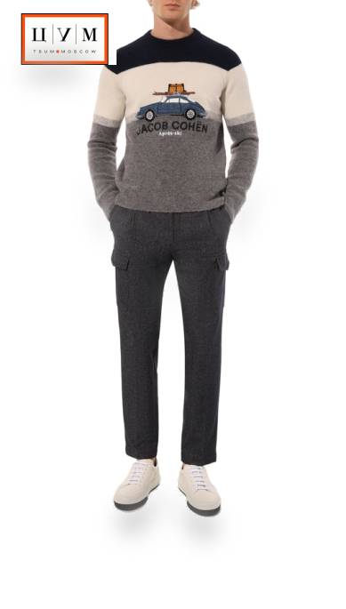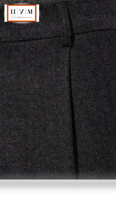 Брюки с защипами сшиты из ткани на основе хлопка, шерсти и кашемира. Модель с открытыми врезными карманами дополнена задними и накладными с клапанами на пуговицах. За комфортную посадку отвечает эластичный пояс со шлевками для ремня.