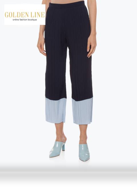 Брюки из плиссированного материала темно-синего оттенка. Модель свободного силуэта с высокой посадкой на талии. Изделие с застежкой на потайную молнию.