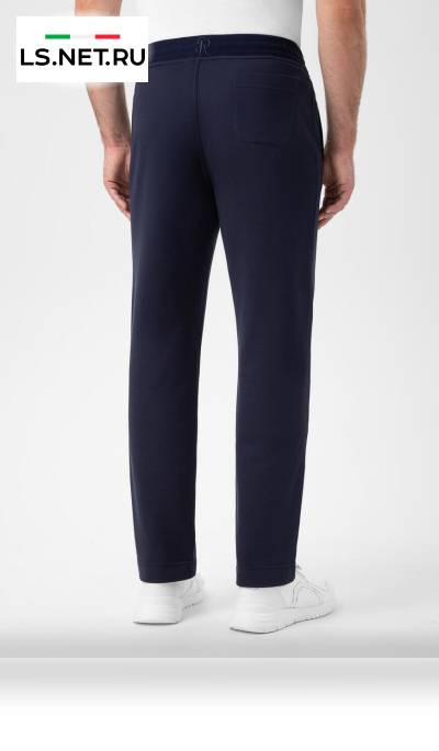 Стильные спортивные брюки Stefano Ricci универсального тёмно-синего цвета. Повседневная модель комфортной посадки выполнена из мягкого трикотажа на основе хлопка и гладкого шёлка. Декор: крупная вышитая монограмма бренда в тон на поясе сзади.