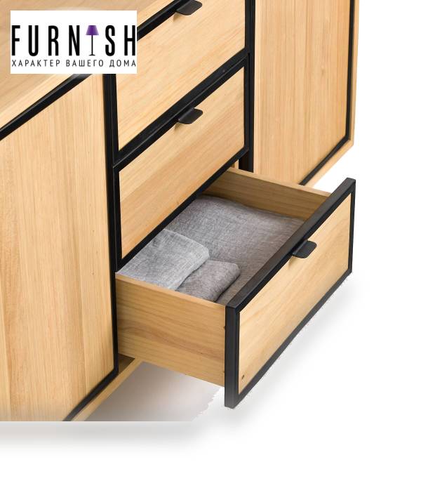 Из массива сосны с легким кранцованным эффектом, буфет из металла и дерева Daffo в модном промышленном стиле.Описание буфета из металла и дерева Daffo : • 1 двойная дверца, открывающая доступ к регулируемой по высоте полке • 1 дверца, открывающая доступ к регулируемой по высоте полке • 3 выдвижных ящика с мягкой системой закрытия • Крепление заклепками. • Ящик предварительно собран, требуется монтаж ножекХарактеристики буфета из металла и дерева Daffo : • Каркас из массива сосны • Окраска с имитацией дуба, отделка нитролаком. • Ножки и окантовка из стали с матовой черной лакировкой и покрытием эпоксидной краской • Крепление заклепками из металла черного цветаРазмеры буфета из металла и дерева Daffo : • Ширина : 178 см. • Высота: 75 см • Глубина: 40 см • Общие размеры. полезные размеры ящика : Д 36 x В 12 x Г 28 смРазмеры и вес упаковки :1 упаковка • Ш.190 x В.76 x Г.46 см • 70 кг