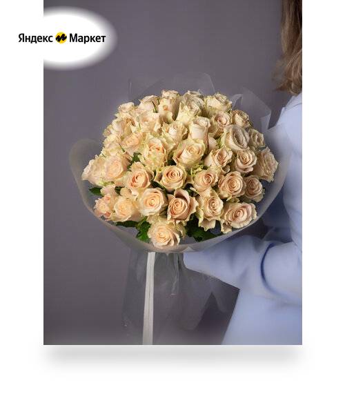 Букет живых цветов из 15 роз кремового цвета сорта Шармант, в матовой упаковке продается в интернет-магазине Яндекс МаркетЭксперт: Роман Петров, консультант по маркетплейсамДата рецензии: 14 октября 2025 годаРекомендация к покупке положительная