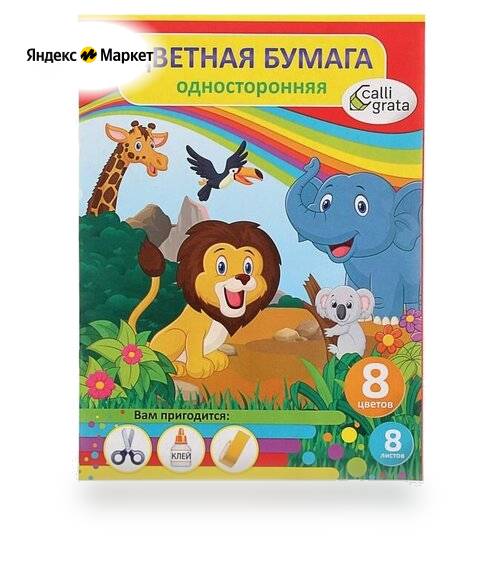 В наборе вы найдете 8 листов цветной бумаги размером 200х285 мм, что позволит вам создавать разнообразные поделки и аппликации. Цвета представлены в широком спектре: желтый, зеленый, красный, коричневый, оранжевый, светло-синий, сиреневый и черный.