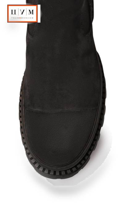Челси с широкими эластичными вставками и круглым отрезным мысом изготовлены вручную из фактурного нубука. Лаконичные ботинки дополнены массивной нескользящей подошвой с рельефным протектором.