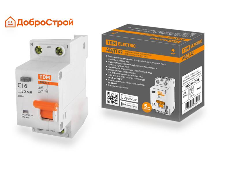АВДТ 32 2P(1P+N) C20А 30мА 4,5кА тип АС TDM - это дифференциальный автомат, предназначенный для защиты электроустановок от токов перегрузки и короткого замыкания, а также для отключения тока при прикосновении человека к токоведущим частям или протекании дифференциального (утечки) тока на землю.