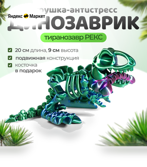 – Антистресс. Дино Ти-Рекс – настоящая фиджет той с расслабляющим кликающим звуком: перебирайте детали фигурки в руках, успокаивайте нервы и концентрируйтесь на важных вещах.