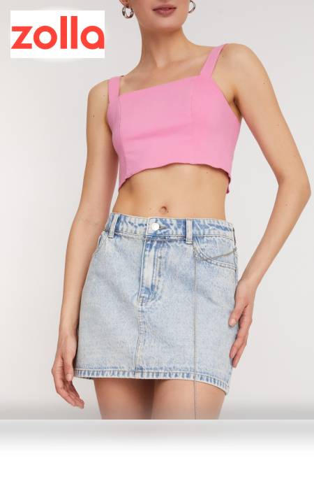 Короткая женская джинсовая юбка, выполненная из плотного хлопкового денима в голубом оттенке и дополненная тонкой декоративной цепочкой на поясе, идеально подойдёт для вашего стильного летнего образа и обеспечит максимальный комфорт в жаркую погоду.