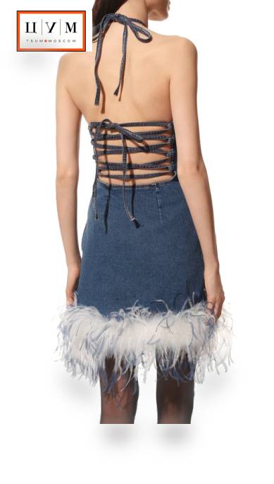Голубое джинсовое мини-платье с шнуровкой на полностью открытой спине сшито из мягкого гладкого хлопка. Джузеппе ди Морабито украсил подол объемной оборкой из белых перьев страуса. Наши стилисты предлагают сочетать облегающую модель с косухой, сумкой и сапогами черного цвета.