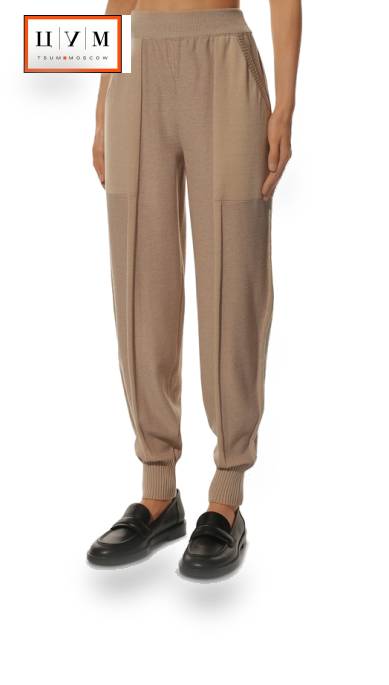 Мастера марки изготовили джоггеры с крупными карманами спереди из мягкого шерстяного трикотажа, который сохраняет оптимальную для тела температуру, не перегревая кожу. Чтобы сделать материал спокойного бежевого оттенка особенно приятным на ощупь, в его состав добавили шелковистую вискозу, а для большей прочности включили тонкий полиэстер.