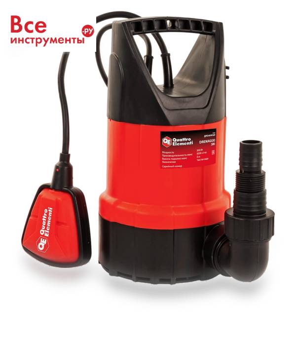 QUATTRO ELEMENTI (Кватро Элемент) Drenaggio 400 представляет собой дренажный насос для перекачивания чистой пресной воды из скважин, колодцев, прудов и иных водных объектов. В его конструкции имеется поплавковый выключатель, что защищает насосное оборудование от работы вхолостую, то есть без воды. Корпус насоса выполнен из пластика.