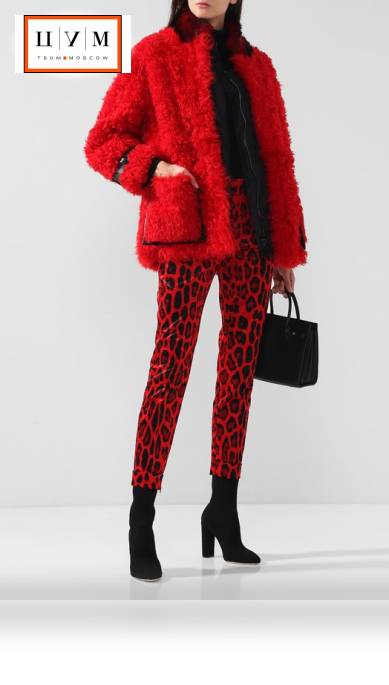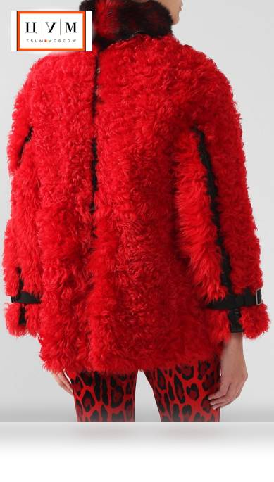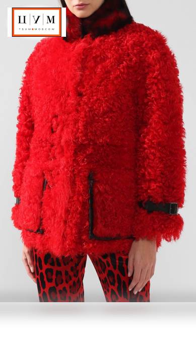Том Форд включил в осенне-зимнюю коллекцию алую укороченную дубленку из овчины. Модель с красно-черным воротником декорирована контрастными кожаными полосами и широкими ремнями с пряжками. Изделие на молнии дополнено крупными накладными карманами по бокам. Вещь утеплена съемным двусторонним пуховым жилетом, который можно носить отдельно.