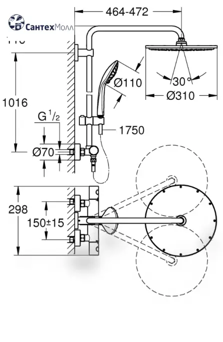 Состав поставки: термостат для душа, душевая стойка, верхний душ, ручной душ, набор для подключения, инструкция