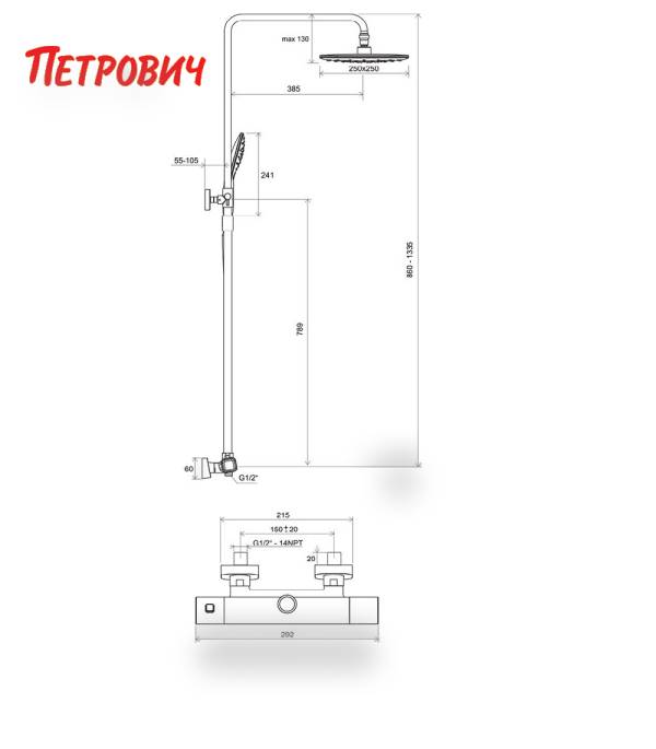 Душевая система RAVAK TD 091.00 X070103 с термостатом с верхним душем D250 F1 и душевой лейкой D120 F3 продается в интернет-магазине Петрович