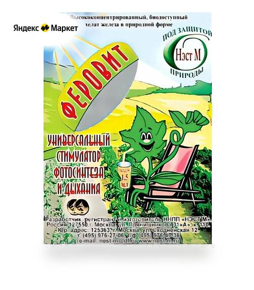 Феровит- предназначен для корневых и некорневых подкормок различных культур открытого и защищённого грунта, включая комнатные и и лекарственные растения, а также хвойные и лиственные деревья и кустарники. Применяется, как профилактическое средство и защита от хлороза при дефиците биодоступного железа. Необходим во всех случаях разрушения хлорофилла и снижения фотосинтетической активности (нестабильные условия произрастания, недостаточная освещенность, болезни, повреждение вредителями). Ускоряет рост и развитие растений, предотвращает опадение цветков. Вызывает раннее и дружное цветение. Способствует лучшему завязыванию плодов, снижению количества незрелых. Увеличивает урожайность. Защищает растения от хлороза, снижает поражение бурой ржавчиной, мучнистой росой, паутинным клещом и др.
