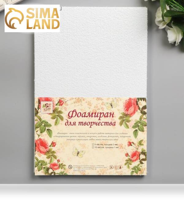 Фоамиран махровый "Белый" 2 мм (набор 5 листов) формат А4 — новый материал в мире творчества и рукоделия! Он поможет реализовать любую хэнд-мэйд фантазию. Это волшебное сырьё называют по-разному: и фоам-бумага, и просто фом или foam, пористая или вспененная резина и даже резиновая замша. В переводе с английского языка «foam» — это «пена». То есть это вспененный этилвинилацетат (EVA), из которого делают спортивные коврики. Материал признан безопасным для здоровья и окружающей среды. Он не токсичен, отлично моется и стоек к атмосферным воздействиям и химическим веществам. На ощупь фоамиран действительно напоминает замшу или пенку для фитнеса. Рукодельницы используют его в скрапбукинге, чтобы придать объём своему эскизу. В квиллинге, ведь фоамиран отлично режется. В украшении упаковок или букетов, чаще всего встречаются именно декоративные цветочки из этого универсального материала. Мастерицы создают изумительные предметы интерьера: кукол, игрушки и много другое. Фоамиран позволяет разгуляться фантазии! Отметим, что при нагревании он становится эластичным, поэтому вы без труда придадите нужную форму или даже чуть растяните изделие. Трудностей с работой у вас не возникнет, стоит лишь помнить, что для склеивания деталей из фоамирана между собой лучше воспользоваться клеем с сильной фиксацией или клеевым пистолетом.