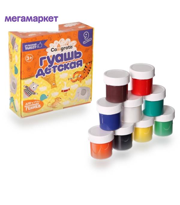 Гуашь 9 цветов Calligrata, 20 мл Гуашь для рисования Calligrata серии "Отличный выбор" предназначена для творческих занятий в школе и дома. Краска производится на основе качественного прозрачного связующего вещества, обеспечивающего чистоту цвета. Плотная, укрывистая текстура красок хорошо смешивается, равномерно наносится практически на любую основу. При высыхании дает бархатистый матовый эффект. Безопасны для детей, нетоксичны. В наборе 9 баночек разных цветов. Объём каждой баночки - 20 мл. Цветовая палитра гуаши Calligrata состоит из классических оттенков.