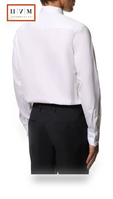Белоснежную сорочку с воротником кент и длинными рукавами мастера марки сшили из гладкого хлопка поплина. В состав дышащего материала добавили стрейчевые волокна, поэтому приталенная модель комфортно садится по фигуре и слегка тянется, не ограничивая движений. Изделие украсили небольшим черным логотипом спереди.
