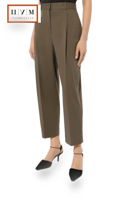 Укороченные брюки оттенка хаки сшили из мягкого хлопкового твила, который слегка тянется, не мешая движениям. Ширину брючин, свободных в бедрах, компенсировали глубокими складками спереди, плавно переходящими в отглаженные стрелки. Такая модель органично будет смотреться и в casual-образе, и в наряде для офиса.