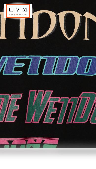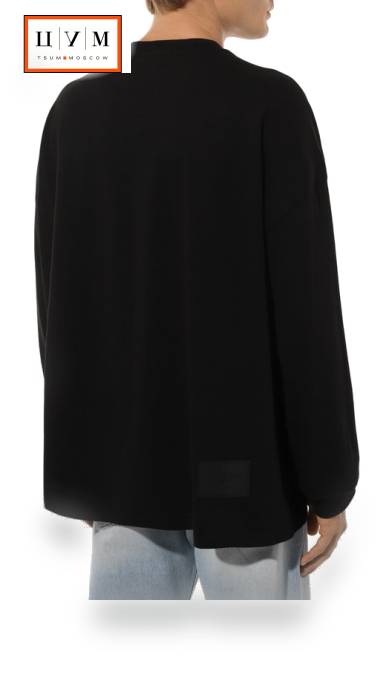 Для изготовления лонгслива свободного кроя использовали хлопковый трикотаж. Модель украсили спереди повторяющимся разноцветными логотипами марки, выполненными разными шрифтами.