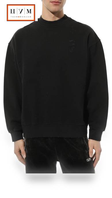Черный свитшот с потертостями, окрашенный в готовом виде по технологии Garment Dyed, украсили брендированными вышивками. Модель сшили из приятного на ощупь футера, обеспечивающего оптимальную терморегуляцию. Изделие органично дополнит повседневный образ с брюками и кедами.