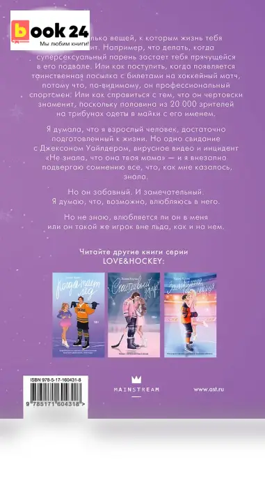 Есть несколько вещей, к которым жизнь тебя не готовит. Например, что делать, когда суперсексуальный парень застает тебя прячущейся в его подвале. Или как поступить, когда появляется таинственная посылка с билетами на хоккейный матч, потому что, по-видимому, он профессиональный спортсмен. Или как справиться с тем, что он чертовски знаменит, поскольку половина из 20 000 зрителей на трибунах одеты в майки с его именем. Я думала, что я взрослый человек, достаточно подготовленный к жизни. Но одно свидание с Джексоном Уайлдером, вирусное видео и инцидент “Я не знала, что она твоя мама”, и я внезапно подвергаю сомнению все, что, как мне казалось, знала. Но он забавный. И замечательный. И я думаю, что, возможно, влюбляюсь в него. Но я не знаю, влюбляется ли он в меня, или он такой же игрок вне льда, как и на нем.
