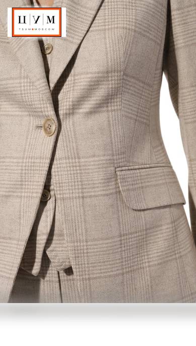 Жакет с заостренными лацканами дополнили одним нагрудным карманом с листочкой и двумя боковыми — с клапанами. Клетчатую модель с застежкой на одну пуговицу выполнили из шерсти с добавлением кашемира, а подкладку — из шелковистой ткани.