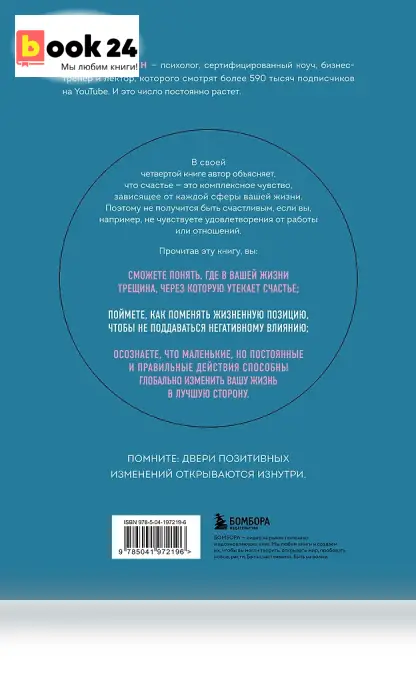 Альберт Сафин — психолог, сертифицированный коуч, бизнес-тренер и лектор, которого смотрят более 590 тысяч подписчиков на YouTube. И это число постоянно растет. В своей четвертой книге он объясняет, что счастье — это комплексное чувство, зависящее от каждой сферы вашей жизни. Поэтому не получится быть счастливым, если вы, например, не чувствуете удовлетворения от работы или отношений. Прочитав эту книгу, вы: - сможете понять, где в вашей жизни трещина, через которую утекает счастье; - поймете, как поменять жизненную позицию, чтобы не поддаваться негативному влиянию; - осознаете, что маленькие, но постоянные и правильные действия способны глобально изменить вашу жизнь в лучшую сторону. Помните: двери позитивных изменений открываются изнутри.