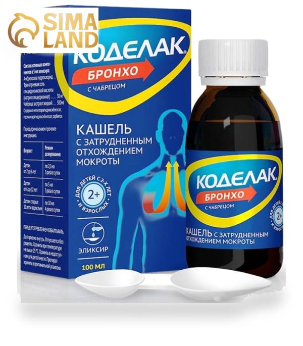 Инструкция по применению препарата Коделак Бронхо® с чабрецом. Эликсир от кашляРегистрационный номерЛСР-006772/09Применение при беременности и в период грудного вскармливанияПрименение препарата Коделак® Бронко с чабрецом эликсир противопоказано при беременности.В случае необходимости приема препарата в период грудного вскармливания, кормление грудью следует прекратить.Влияние на способность управлять транспортными средствами, механизмамиПрепарат не влияет на способность управлять транспортными средствами и различными механизмами, а также на занятия другими потенциально опасными видами деятельности, требующими повышенного внимания и быстроты психомоторных и двигательных реакций.Форма выпускаЭликсир.По 50, 100, 125 и 200 мл во флаконы из темного стекла.Один флакон с инструкцией по применению и мерной ложкой помещают в пачку из картона.Условия храненияХранить при температуре не выше 25 °С. Хранить в недоступном для детей месте.Срок годности3 года. Не использовать по истечении срока годности, указанного на упаковке.Условия отпуска из аптекБез рецепта.Владелец регистрационного удостоверения/организация, принимающая претензии потребителейПАО "Отисифарм", Россия, 123317, г. Москва, ул. Тестовская, д.10Тел: +7 (800) 775-98-19, Факс: +7 (495) 221-18-02Состав Коделак Бронхо с Чабрецом эликсир фл. 100 мл ( с 2 лет )Торговое название препарата: Коделак® Бронхо с чабрецом.Лекарственная форма: эликсир.Состав на 5 мл эликсираАктивные вещества:амброксола гидрохлорид - 10 мг, тринатриевая соль глицирризиновой кислоты (натрия глицирризинат) - 30 мг, чабреца экстракт жидкий - 500 мг.Вспомогательные вещества:метилпарагидроксибензоат (нипагин) - 3,75 мг, пропилпарагидроксибензоат (нипазол) - 1,25 мг, сорбитол (сорбит) - 3000 мг, вода очищенная - до 5 мл.Описание: жидкость от светло-коричневого до коричневого цвета. В процессе хранения допускается об-разование осадка.Фармакотерапевтическая группаотхаркивающее комбинированное средствоКод АТХ[R05CА10]Фармакологические свойстваКомбинированный препарат для лечения кашля, оказывает муколитическое и отхаркивающее действие, а также обладает противовоспалительной активностью.Действие эликсира КОДЕЛАК® БРОНХО с ЧАБРЕЦОМ обусловлено фармакологическими свойствами его компонентов:амброксол обладает секретомоторным, секретолитическим и отхаркивающим действием, нормализует нарушенное соотношение серозного и слизистого компонентов мокроты, увеличивает секрецию сурфактанта в альвеолах. Уменьшает вязкость мокроты и способствует ее отхождению;глициррат (глицирризиновая кислота и её соли) обладает противовоспалительным и противовирусным действием. Оказывает цитопротекторное действие благодаря антиоксидантной и мембраностабилизирующей активности. Усиливает действие эндогенных глюкокортикостероидов, оказывая противовоспалительное и противоаллергическое действие. Благодаря выраженной противовоспалительной активности, способствует уменьшению воспалительного процесса в дыхательных путях;экстракт травы чабреца содержит смесь эфирных масел, обладающих отхаркивающим и противо-воспалительным действием. Кроме того, экстракт травы чабреца обладает слабыми спазмолитическими и репаративными свойствами.Показания к применению Коделак Бронхо с Чабрецом эликсир фл. 100 мл ( с 2 лет )Заболевания дыхательных путей с образован