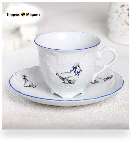 Кофейная пара «Рококо. Гуси»Кофейная пара «Рококо. Гуси» — это изысканный и стильный набор, который станет прекрасным дополнением к вашему утреннему ритуалу. Чашка объёмом 100 мл и блюдце диаметром 12,5 см выполнены из высококачественного фарфора, что обеспечивает долговечность и прочность изделия.Дизайн кофейной пары «Рококо. Гуси» вдохновлён стилем рококо, который отличается изяществом, лёгкостью и изысканностью. На поверхности чашки и блюдца изображены элегантные гуси, которые придают набору особый шарм и очарование.Эта кофейная пара идеально подойдёт для любителей кофе, которые ценят красоту и стиль в каждой детали. Она станет отличным подарком для близких людей или украшением вашего собственного дома.Особенности кофейной пары: Изящный дизайн в стиле рококо с изображением гусей. Высококачественный фарфор, обеспечивающий долговечность и прочность. Небольшой объём чашки (100 мл) подходит для эспрессо. Диаметр блюдца (12,5 см) позволяет удобно разместить чашку.Благодаря своему дизайну и качеству исполнения, кофейная пара «Рококо. Гуси» станет не только функциональным предметом, но и настоящим произведением искусства, которое будет радовать вас каждый день.