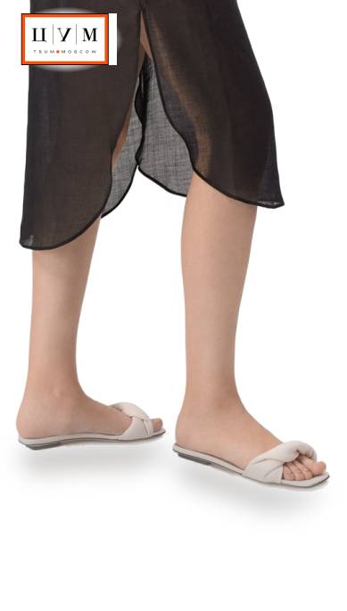 Шлепанцы с квадратным мысом выполнили из мягкой кожи, а тонкую подошву дополнили небольшим скульптурным каблуком. Широкую перемычку модели декорировали объемным узлом.