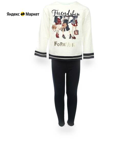 Комплект состоит из джемпера и леггинсов. Джемпер украшен ярким принтом. Комплект выполнен из хлопка с небольшим добавлением эластана и полиэстера.