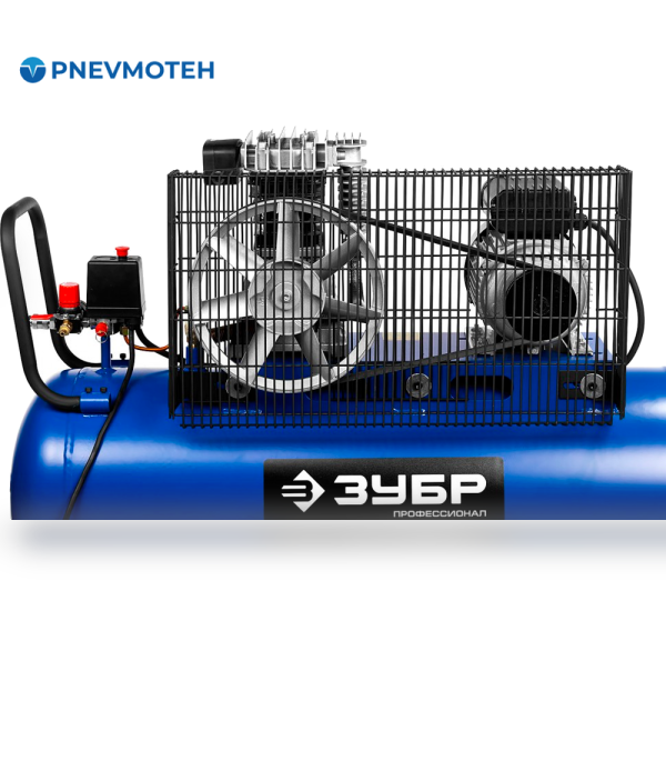Устройство оснащено горизонтальным ресивером объемом 100 литров, что позволяет накапливать сжатый воздух и обеспечивать стабильную работу.