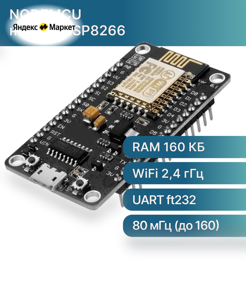 Идеальная база для создания Интернет вещей и иных модулей управления по беспроводной сети Wi-Fi. Модуль предоставляет 11 портов ввода-вывода общего назначения. Некоторые обладают дополнительными функциями: - D9, D10 - UART- D1, D2 - I2C/TWI- D5 - D8 - SPI- D1 - D10 - выходы с ШИМ- A0 - вход с АЦП (аналоговый).