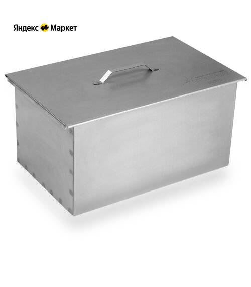 Крышка домиком с ручкой и дымоотводом позволяет конденсату не капать на продукты, а аккуратно стекать на дно коптильни по стенкам. Внутри коптильни установлены 2 яруса крепких решеток с ручками, прутья которых имеют диаметр 3 мм. Двухярусное расположение позволяет вместить большое количество продуктов, например целую курицу и сало. На дне установлен поддон жироуловитель на ножках, который можно обмотать фольгой на время использования, и жир будет скапливаться только на нем, позволяя щепе оставаться чистой и не выделять канцерогены. По бокам и на крышке удобные толстые круглые ручки – взявшись за них вы никогда не порежете пальцы или ладони, переноска коптильни будет очень удобна.