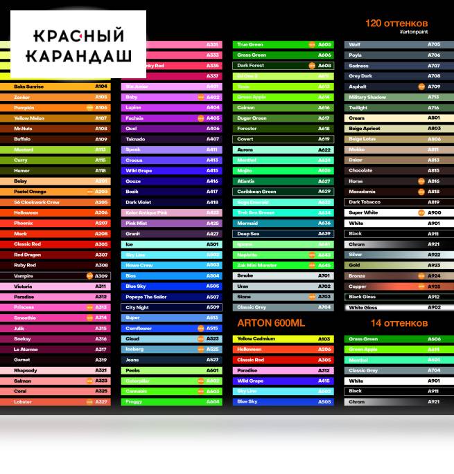 Аэрозольная краска Arton на сегодняшний день является самой одной из самых популярных красок в России как среди начинающих художников, так и среди профессионалов. Выпускается с оптимальным давлением, которое позволит Вам равномерно и плотно покрывать любые поверхности. В основе краски Arton – качественный пигмент, который хорошо ложится, не растекается и мало подвержен выгоранию. Arton несколько лет является главным выбором у организаторов фестивалей и конкурсов при выборе аэрозольной краски. С 2009 года краска входит в арсенал многих профессиональных художников из России и СНГ. Их опыт позволил на деле установить, что качество аэрозольной краски этого производителя не уступает качеству аэрозолей от мировых лидеров. Сегодня Arton – это 98 живых и ярких цветов + золото, которые позволят вам воплотить в жизнь самые невероятные идеи! Характеристики: - Объем баллона 520 мл, рабочий объем – 400 мл - Вес нетто – 300 гр. (на 7% больше чем у ичной продукции конкурентов) - Абсолютно матовая - Высокая кроющая способность ,перекрывает хром с первого раза - Краска не растрескивается - Высокая пигментация - Быстрое время высыхания - Бесперебойная работа - Высокая скорость нанесения - Специальный состав краски исключающий подтеки - Нанесение на все виды поверхностей - Низкое, среднее давление в зависимости от кэпов - Толщина линии зависит от силы нажатия кэпа - Мягкая пружина клапана.