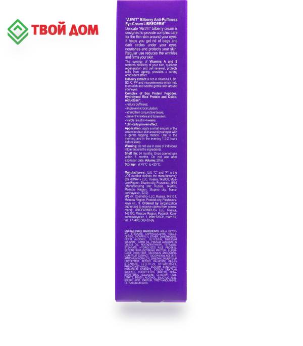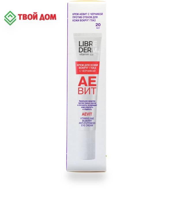 Артикул: 1882-257. Объем: 20 мл, Вес: 33 гр, Размер упаковки: 3.5 x 15.2 x 3.5 см, Температурное ограничение: Нет, Вид: Крем. Крем с черникой Librederm Аевит против отеков для кожи вокруг глаз с черникой предназначен для комплексного ухода за тонкой кожей вокруг глаз: избавляет от мешков и темных кругов под глазами, питает и защищает кожу. Питательный крем помогает в борьбе против морщин и синяков вокруг глаз и делает кожу упругой. Витамины А и Е в синергии восстанавливают эластичность кожи, ускоряют процессы регенерации и обновления клеток, защищают клетки от старения, обеспечивают мощное антиоксидантное воздействие. Экстракт черники богат витаминами А, В1, В2, С, РР и микроэлементами, благодаря чему питает и успокаивает нежную кожу вокруг глаз. Омолаживающий крем с пептидами протеина сои и гидролизованного рисового протеина борется против отеков и предупреждает появление морщин и дряблость кожи. Способ применения: небольшое количество крема наносить на чистую кожу вокруг глаз легкими похлопывающими движениями подушечек пальцев утром и вечером за 1,5–2 часа до сна. Состав: aqua, glyceryl stearate, caprylic/capric triglyceride, dicaprylyl ether, dimethicone, cetyl alcohol, glycerin, triticum vulgare germ oil, prunus amygdalus dulcis oil, pentaerythrityl tetraisostearate, hydrolyzed rice protein, glycine soja (soybean) protein, superoxide dismutase, vaccinium angustifolium fruit extract, tocopheryl acetate, ammonium acryloyl dimethyltaurate/vp copolymer, retinyl palmitate, peg-75 stearate, ceteth-20, steareth-20, phenoxyethanol, sodium benzoate, potassium sorbate, sodium dextran sulfate, tocopherol (mixed), betasitosterol, squalene, glyceryl linolenate, benzyl alcohol, salicylic acid, sorbic acid, parfum, triethanolamine, tetrasodium edta.